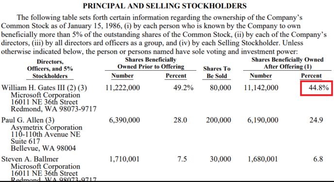 At the time of Microsoft’s IPO on March 13, 1986, Bill owned 11,142,000 shares, or 44.8% of the company.